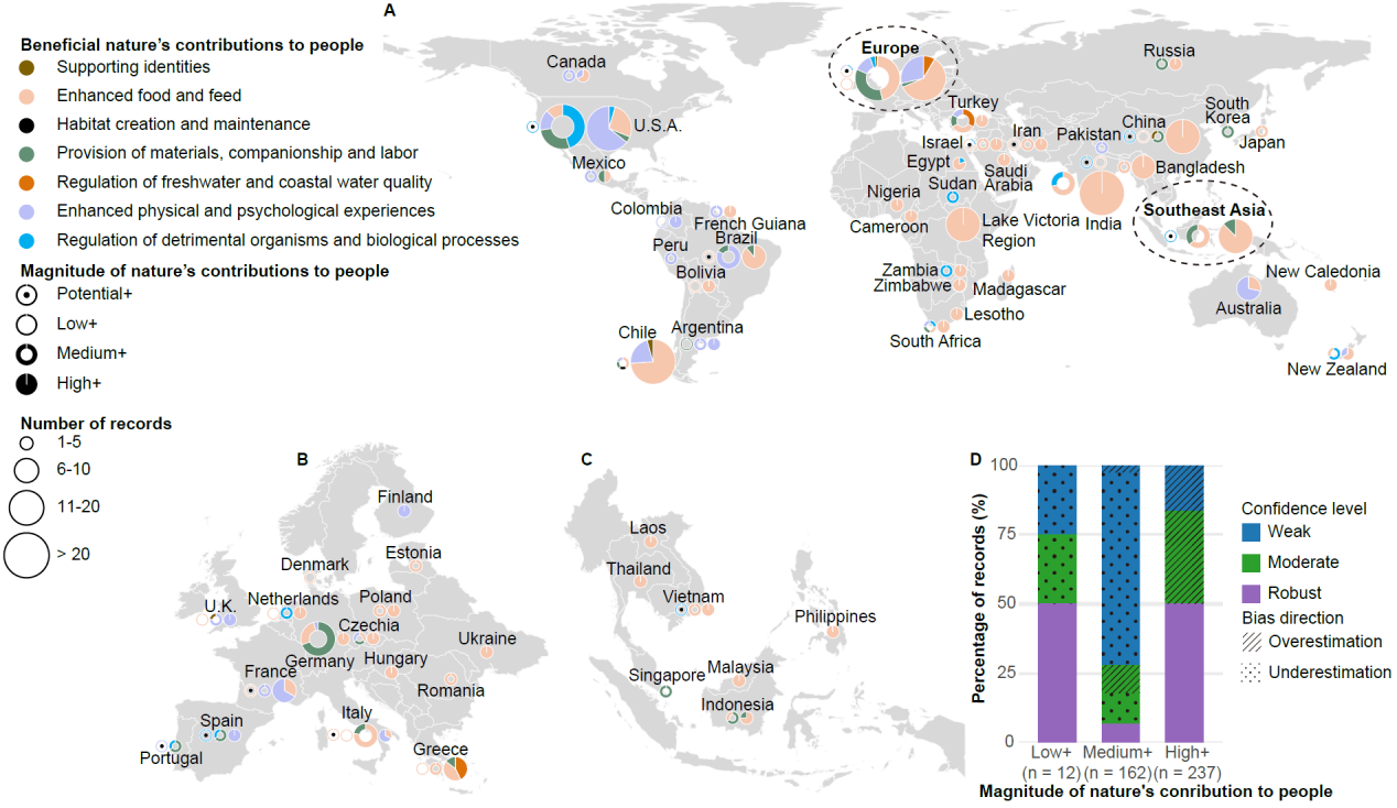 該研究基于“自然對人類貢獻(Nature’s Contributions to People)”框架開發(fā)了一套半定量評估方法,系統(tǒng)性評估了全球外來淡水大型動物對人類社會產(chǎn)生的正面與負面影響。研究結(jié)果表明,已有 93種外來淡水大型動物(占現(xiàn)存物種的43%)被引入到其本土分布區(qū)之外,涵蓋了魚類、哺乳類、爬行類和兩棲類。該研究共識別了429項正面社會經(jīng)濟效應(yīng)記錄(圖1),包括提升食物供給(57%)、促進休閑漁業(yè)和生態(tài)旅游(20%)以及提供生產(chǎn)和貿(mào)易所需的原材料供給(12%)等。一些淡水大型動物如鯉魚(Cyprinus carpio)、草魚(Ctenopharyngodon idella)和尖齒胡鯰?(Clarias gariepinus)等在全球多地被引入后已成為當(dāng)?shù)鼐用裰匾氖澄飦碓春蜐O業(yè)資源,而尼羅鱷(Crocodylus niloticus)和暹羅鱷等(Crocodylus siamensis)則常被引入到本土分布區(qū)之外用于發(fā)展養(yǎng)殖業(yè)和寵物貿(mào)易。研究還發(fā)現(xiàn),亞洲和非洲引入外來淡水大型動物的主要動機是增強食物供給,而在北美則主要與休閑漁業(yè)和寵物貿(mào)易相關(guān)。