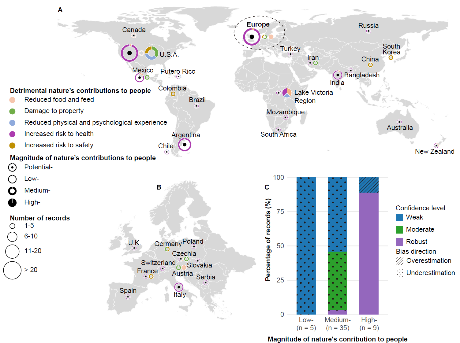 研究進一步指出,盡管外來淡水大型動物在引入地區(qū)帶來了可觀的經(jīng)濟收益,但其造成的負面社會經(jīng)濟影響不可忽視(圖2)。超過140項記錄表明外來淡水大型動物對人類健康(63%)、食物供給(10%)和財產(chǎn)設(shè)施(10%)等造成了損害。例如,河馬(Hippopotamus amphibius)被引入到哥倫比亞后由于缺乏天敵在當(dāng)?shù)匮杆俜敝?,其強大的攻擊性對?dāng)?shù)鼐用竦娜松戆踩珮?gòu)成了直接威脅。尼羅河鱸(Lates niloticus )在維多利亞湖的引入雖然創(chuàng)造了明顯的經(jīng)濟收益,卻導(dǎo)致了當(dāng)?shù)乇就留~類資源迅速下降,進而威脅到低收入群體的食物供給并間接地促進了疾病的傳播。由于外來物種導(dǎo)致的一些影響如生計資本下降和疾病傳播等對當(dāng)?shù)厣鐣斐傻男?yīng)具有滯后性和隱蔽性,其負面社會經(jīng)濟效應(yīng)在一些地區(qū)可能被嚴(yán)重低估。
