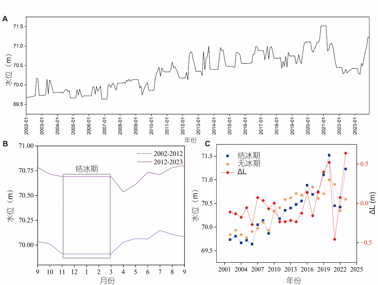 圖1 興凱湖水位變化趨勢。(A)2002–2023年水位月變化;(B)2002–2012年及2012–2023年興凱湖月均水位變化,虛線表示結冰期湖水位;(C)2002–2023年興凱湖結冰期(11月至次年3月)與無冰期(4–10月)的年均水位變化,紅色實線代表無冰期與結冰期水位差的年變化(前者減去后者)。