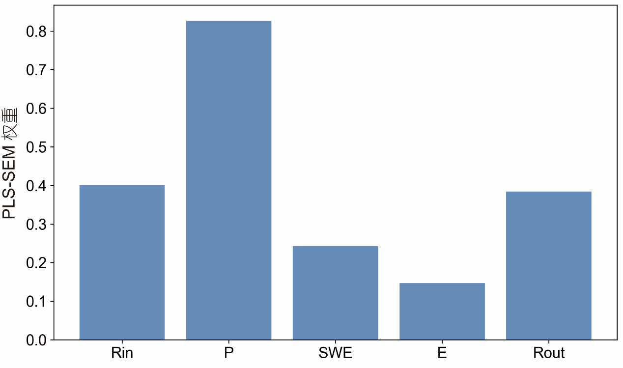 圖 2 入湖徑流量(Rin)、降水量(P)、積雪水當量(SWE)、湖面蒸發量(E)以及出湖徑流量(Rout)對興凱湖水位變化的PLS-SEM權重分析。