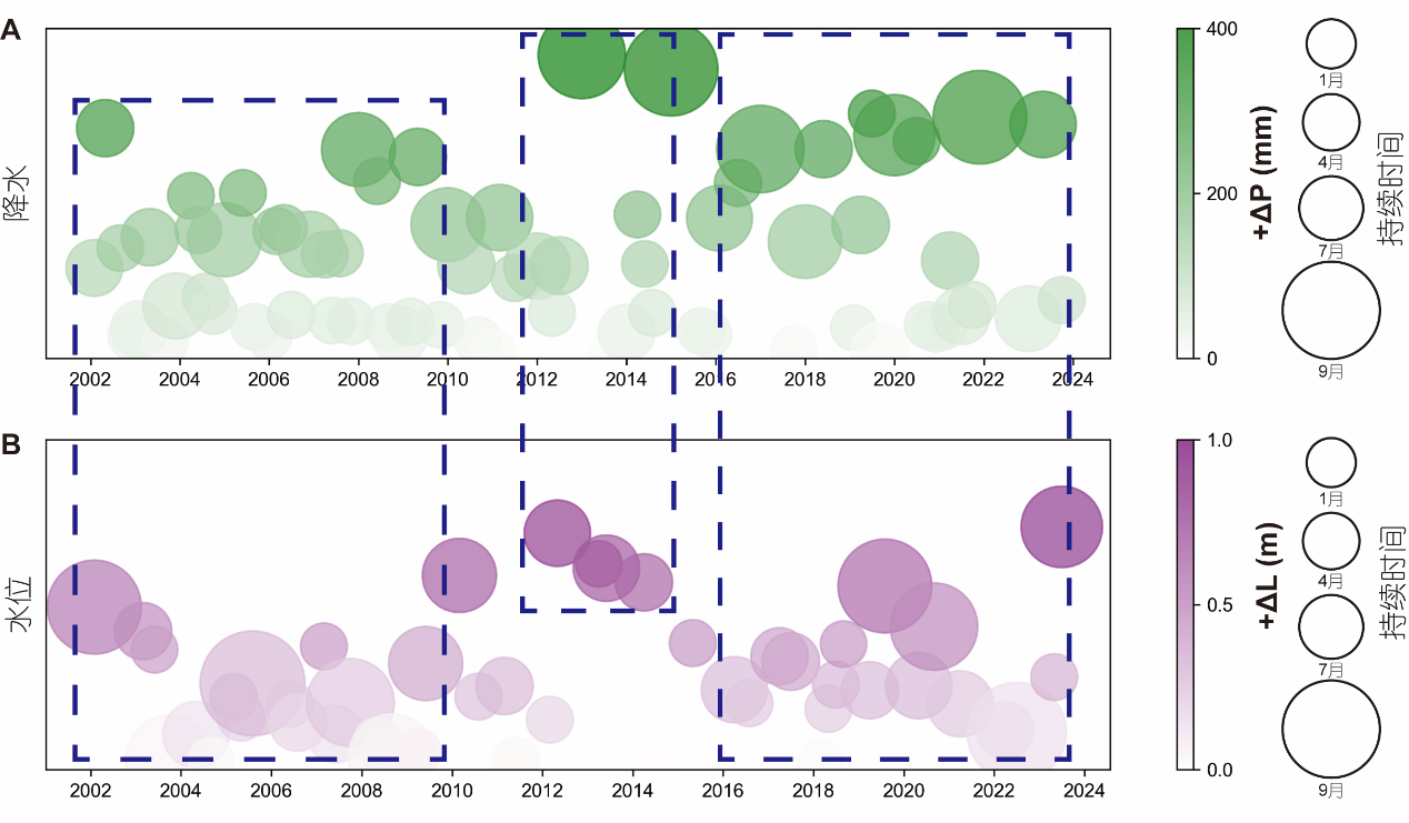 圖3 2002–2023年興凱湖流域連續降水增加事件變化與湖泊水位波動之間的關系。(A)興凱湖流域連續降水上升事件的幅度與持續時間;(B)興凱湖水位連續上升事件的幅度與持續時間。藍色虛線框表示降水(或水位)顯著增加且持續時間較長的時期。+ΔP表示連續降雨增加時期內事件的極大值與極小值之差;+ΔL表示湖水位連續上升時期內的事件極大值與極小值之差。每個陰影圓表示一次獨立的連續降水增加事件或水位上升事件。圓圈的大小表示事件的持續時間,顏色深淺表征降水或水位的峰值增幅。需要注意的是,圖中圓圈的重疊是可視化的展示,并不意味著事件同時發生。氣泡越大表示持續時間越長;氣泡顏色越深表示水位或降水的峰值增幅越大。