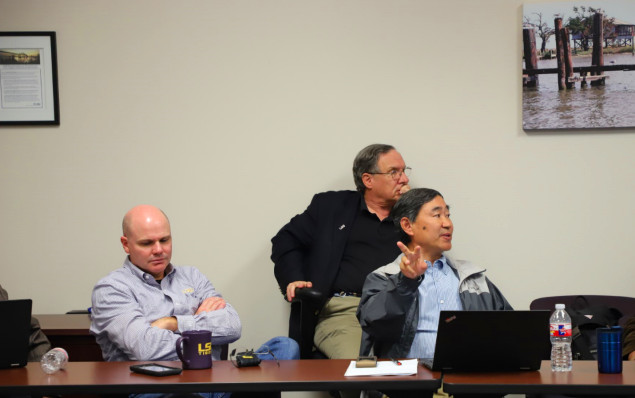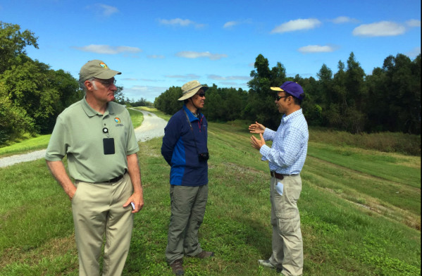 10月16 -17日,在路易斯安那州自然資源部海岸管理辦公室Ed Britton博士、路易斯安娜州立大學(xué)海岸與環(huán)境學(xué)院院長(zhǎng)Christopher D'Elia教授、侯愛(ài)新教授等相關(guān)專家陪同下,參觀了建造過(guò)程中的密西西比河流中心,詳細(xì)了解了密西西比河三角洲濕地大型實(shí)景模型模擬的建造過(guò)程和未來(lái)使用情況。前往墨西哥灣,深入考察了紅樹(shù)林及河口三角洲濕地恢復(fù)工程。由于海平面上升和陸地下沉導(dǎo)致濕地大面積喪失,路易斯安那州政府利用河口及濱海的底泥,疏浚到被淹沒(méi)的濕地區(qū)域,提高地表以恢復(fù)退化鹽沼。項(xiàng)目組考察了不同恢復(fù)年限下的濕地恢復(fù)區(qū),針對(duì)其濕地植被演替、基質(zhì)理化性質(zhì)及水文情勢(shì)變化進(jìn)行了深入探討,這為我國(guó)濕地基質(zhì)恢復(fù)、應(yīng)對(duì)海平面上升的濱海濕地恢復(fù)技術(shù)提供了良好的案例。