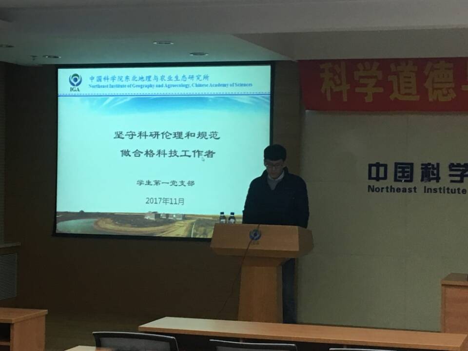 2017年11月16日上午10時,由東北地理所研究生部和研究生黨總支部共同主辦的“科研道德與學風建設(shè)宣講教育活動”專題報告會在地理綜合樓四樓報告廳舉辦。此次活動以“弘揚科研道德,倡導學術(shù)誠信”為主題,旨在繼承和弘揚我所“團結(jié)、務(wù)實、開拓、發(fā)展”的精神,進一步保持和發(fā)揚我所的優(yōu)良學風,更好地培養(yǎng)品學兼優(yōu)、人格高尚且具有創(chuàng)新意識的高素質(zhì)人才。研究生黨總支部書記王玉榮老師出席了本次活動,同時參加本次活動的同學有2017級博士和2016級碩士研究生以及其余各年級的黨員和積極分子。