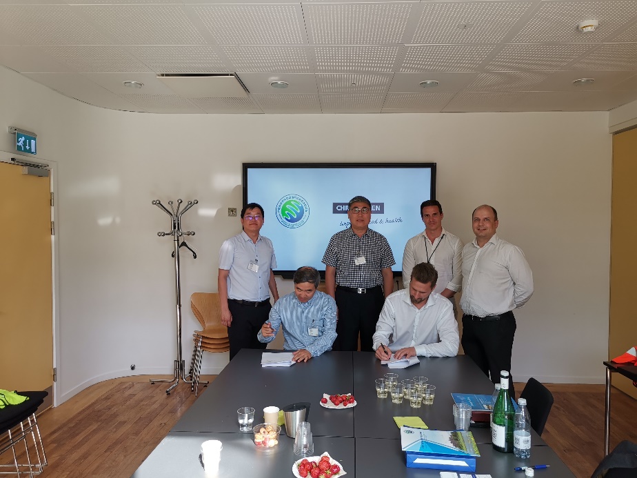 6月24日至25日,何興元所長(zhǎng)一行應(yīng)丹麥CHR-HANSEN集團(tuán)邀請(qǐng),考察了集團(tuán)位于丹麥Hvidovre的有益菌劑生產(chǎn)基地及植物創(chuàng)新研發(fā)中心。期間,何興元所長(zhǎng)介紹了我所基本情況及我所在農(nóng)業(yè)研究領(lǐng)域所取得的主要成果,CHR-HANSEN基地負(fù)責(zé)人Kim Muller Christensen博士介紹了CHR-HANSEN集團(tuán)的發(fā)展歷程及在全球范圍的經(jīng)營(yíng)情況、科技創(chuàng)新布局等,植物創(chuàng)新研發(fā)中心主管Lars Molbak博士介紹了Plant Health Innovation研發(fā)中心的基本情況及未來(lái)的合作方向。李向楠研究員就其承擔(dān)的CHR-HANSEN首個(gè)中國(guó)項(xiàng)目情況進(jìn)行了介紹。會(huì)議中,何興元所長(zhǎng)與CHR-HANSEN集團(tuán)簽署了科技創(chuàng)新合作協(xié)議,雙方將以合作研究項(xiàng)目為契機(jī),進(jìn)一步加大科研合作。會(huì)后,何興元所長(zhǎng)一行在CHR-HANSEN基地負(fù)責(zé)人等陪同下考察了CHR-HANSEN有益菌劑生產(chǎn)線。