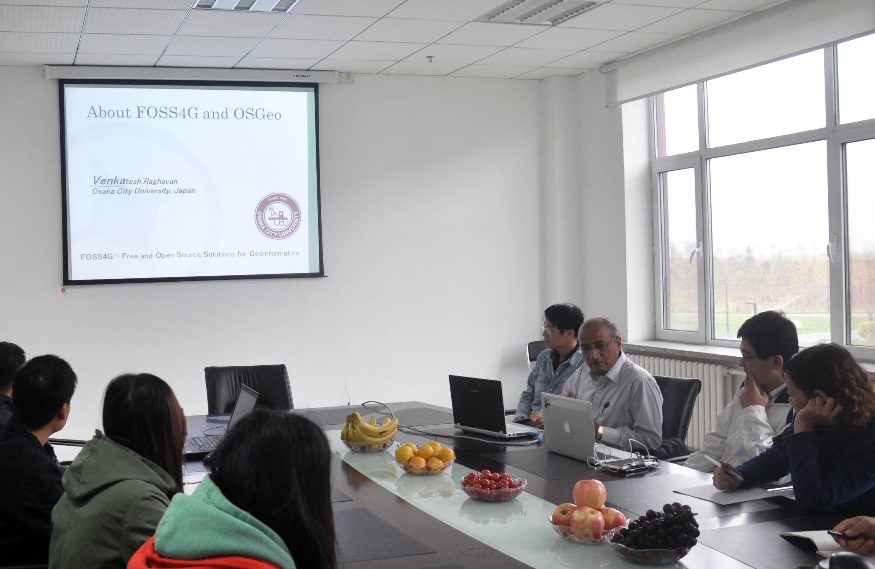 2014年10月1-3號,日本大阪市立大學Venkatesh Raghavan教授與中國科學院大學宋現鋒教授來我所進行開源地理空間基金會(OSGeo)中國中心發展事宜討論,并進行學術交流。10月1號上午在長春園區綜合樓二樓會議室,Venka教授做了三場精彩的專題報告,報告會由我所信息中心高級工程師卜坤主持,吉林大學張艷紅教授及所內外研究生共二十多人參加。