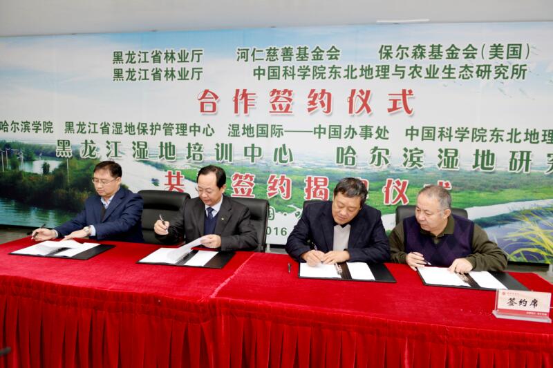 2016年11月22日上午,中國科學(xué)院東北地理與農(nóng)業(yè)生態(tài)研究所與黑龍江省林業(yè)廳在哈爾濱市簽署了全面戰(zhàn)略合作協(xié)議,在此合作框架下,東北地理所與黑龍江省濕地保護(hù)管理中心、濕地國際-中國辦事處及哈爾濱學(xué)院簽署“關(guān)于支持共建‘黑龍江濕地培訓(xùn)中心’、‘哈爾濱濕地研究院’合作框架協(xié)議”。我所張平宇副所長出席簽字儀式,并與黑龍江省林業(yè)廳廳長楊國亭、哈爾濱市政府副秘書長王曉春等領(lǐng)導(dǎo)共同為“黑龍江濕地培訓(xùn)中心”、“哈爾濱濕地研究院”揭牌。我所呂憲國研究員被聘為哈爾濱濕地研究院學(xué)術(shù)委員會主任委員,并在簽約儀式上宣讀了哈爾濱濕地研究院組織機(jī)構(gòu)及學(xué)術(shù)委員會名單。參加簽約儀式的還有我所所長助理姜明研究員、哈區(qū)農(nóng)業(yè)中心副主任宋鳳斌研究員、趙恒田研究員、王強(qiáng)副研究員等。