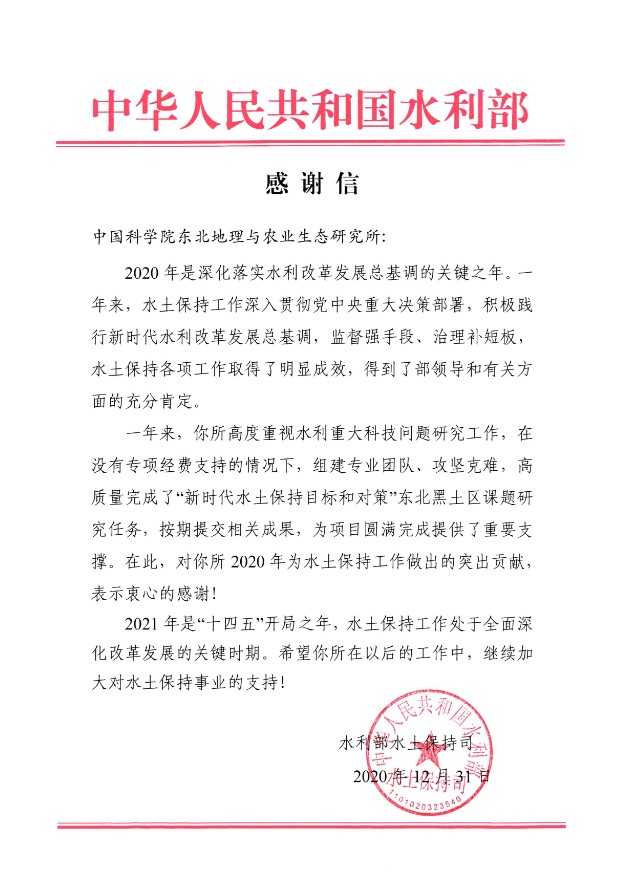 為了深入貫徹黨中央重大決策部署,積極踐行新時代水利改革發展總基調,監督強手段、治理補短板,水利部于2019年啟動了“新時代水土保持目標和對策”水利重大科技研究項目,全國按八大片水土保持分區開展攻關。在沒有專項經費支持的情況下,東北地理所黑土退化與修復學科組會同黑龍江省水利科學研究院、吉林省水土保持科學研究院、吉林農業大學、松遼流域水土保持監測中心站,承擔了“東北黑土區新時代水土保持目標與對策”專題研究,系統梳理了東北黑土區概況、水土流失現狀及其變化,在系統分析國家硬性規定退耕面積、需治理且能治理的水土流失面積、不能治理水土流失面積的基礎上,提出了到本世紀中葉東北黑土區允許水土流失率和水土保持率、新時代東北黑土區水土保持目標任務、防治對策、水土保持考評指標,按期提交了相關成果,近日通過水利部組織的驗收。為此,水利部水土保持司給東北地理所發來感謝信,肯定了研究所在2020年度為國家水土保持做出的突出貢獻,希望繼續加大對水土保持事業的支持。