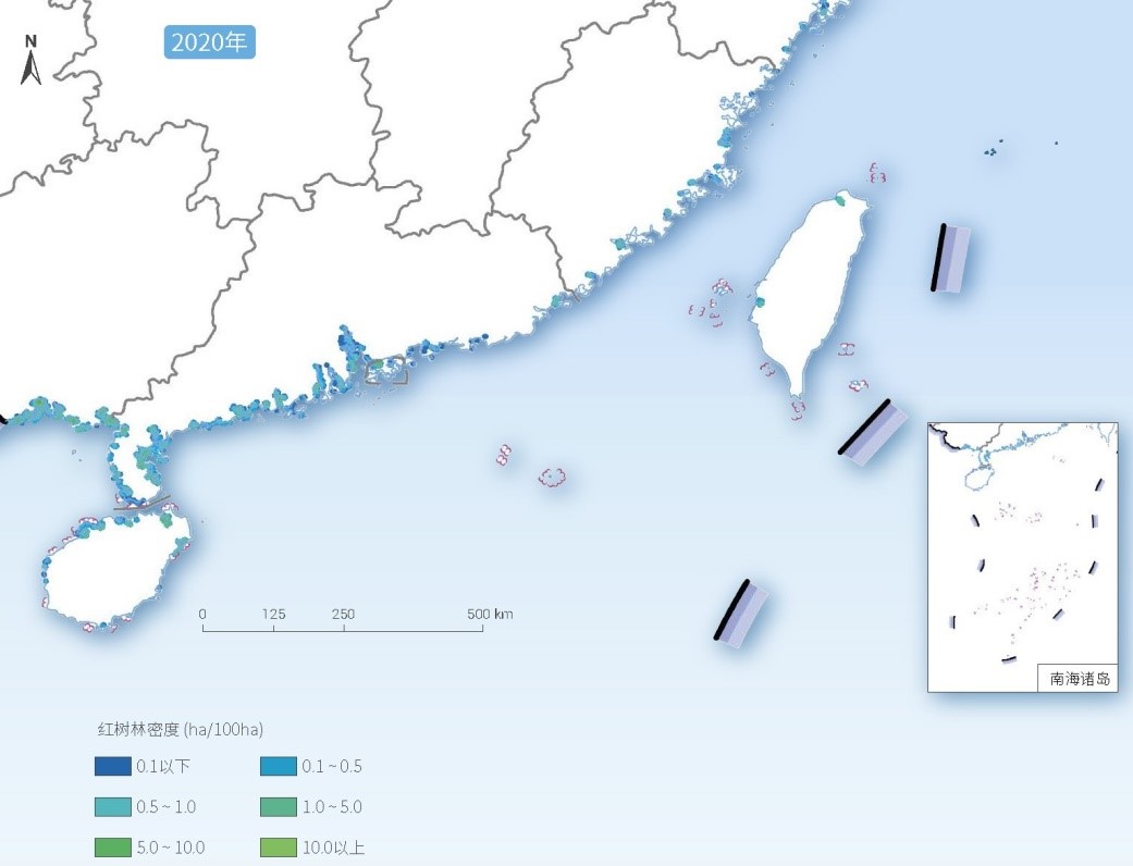《中國紅樹林動態(tài)變化》案例對應(yīng)SDG 14.2,提出了基于機(jī)器學(xué)習(xí)的紅樹林快速提取方法,分析了2015 年、2018 年和2020 年中國紅樹林空間分布及變化特征。結(jié)果表明,2015~2020 年間,中國紅樹林面積凈增長16%,廣東和廣西沿岸紅樹林增加最為顯著;另外,自然保護(hù)區(qū)內(nèi)的紅樹林得到了良好的保護(hù)和恢復(fù);自SDGs 實施以來,中國紅樹林保護(hù)和恢復(fù)的成效顯著。