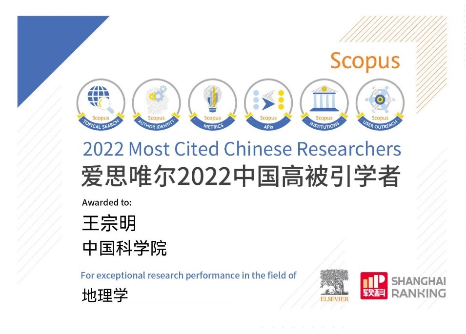 王宗明研究員入選Elsevier 2022“中國高被引學(xué)者”榜單