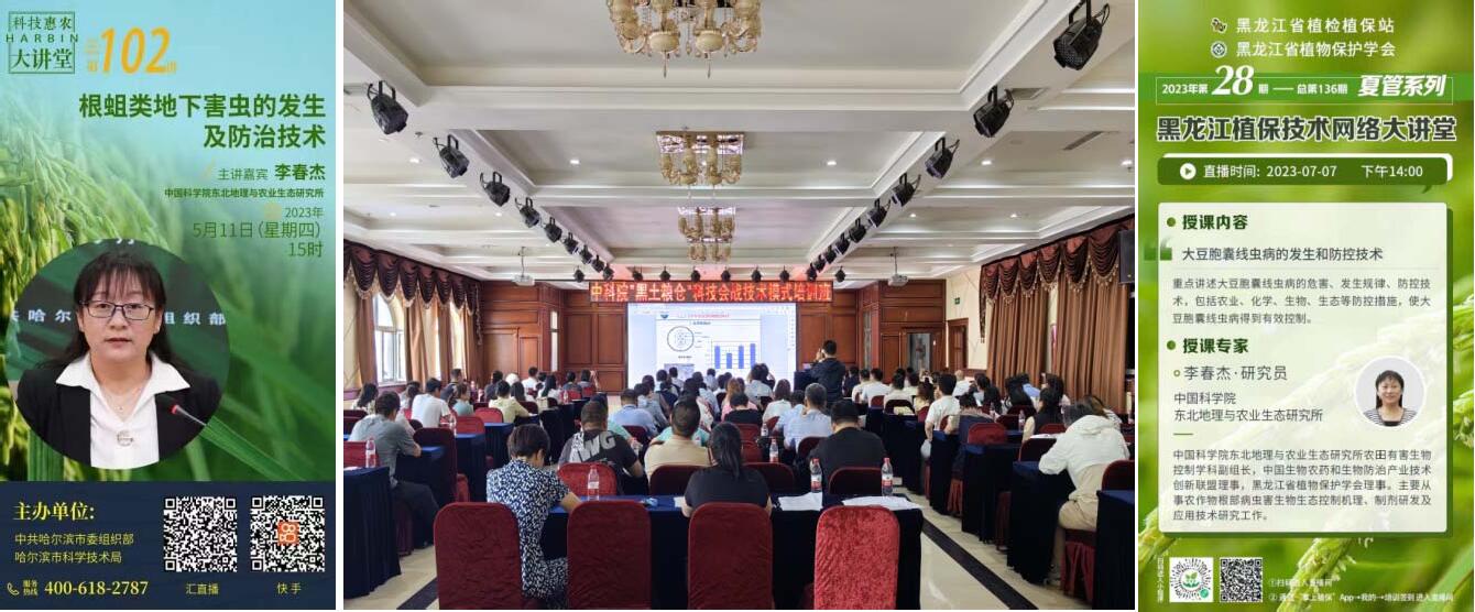 應(yīng)哈爾濱市科技局、齊齊哈爾市科技局、黑龍江省植物保護(hù)學(xué)會(huì)和黑龍江省植檢植保站的邀請(qǐng),針對(duì)當(dāng)前農(nóng)作物病蟲(chóng)害發(fā)生特點(diǎn)和防治過(guò)程中存在的問(wèn)題,李春杰分別于5月11日在“科技惠農(nóng)大講堂”講解了“根蛆類地下害蟲(chóng)的發(fā)生和防治技術(shù)”、6月29日在“中科院專家鶴城交流培訓(xùn)會(huì)”上交流了“農(nóng)作物根部病蟲(chóng)害生防制劑的研發(fā)和應(yīng)用”、7月7日在“黑龍江植保技術(shù)網(wǎng)絡(luò)大講堂”上講解了“大豆胞囊線蟲(chóng)病的發(fā)生和防控技術(shù)”。李春杰宣講的“黑土糧倉(cāng)”科技會(huì)戰(zhàn)的重要科技成果,主要涉及東北地理所自主研發(fā)的昆蟲(chóng)病原線蟲(chóng)生物殺蟲(chóng)劑及其應(yīng)用技術(shù)、間套作蔥屬作物對(duì)線蟲(chóng)病的防控技術(shù)等生物生態(tài)控制機(jī)理和應(yīng)用示范推廣效果等,為糧食安全生產(chǎn)和土壤健康、環(huán)境友好提供了保障,使農(nóng)作物產(chǎn)能得到提升。