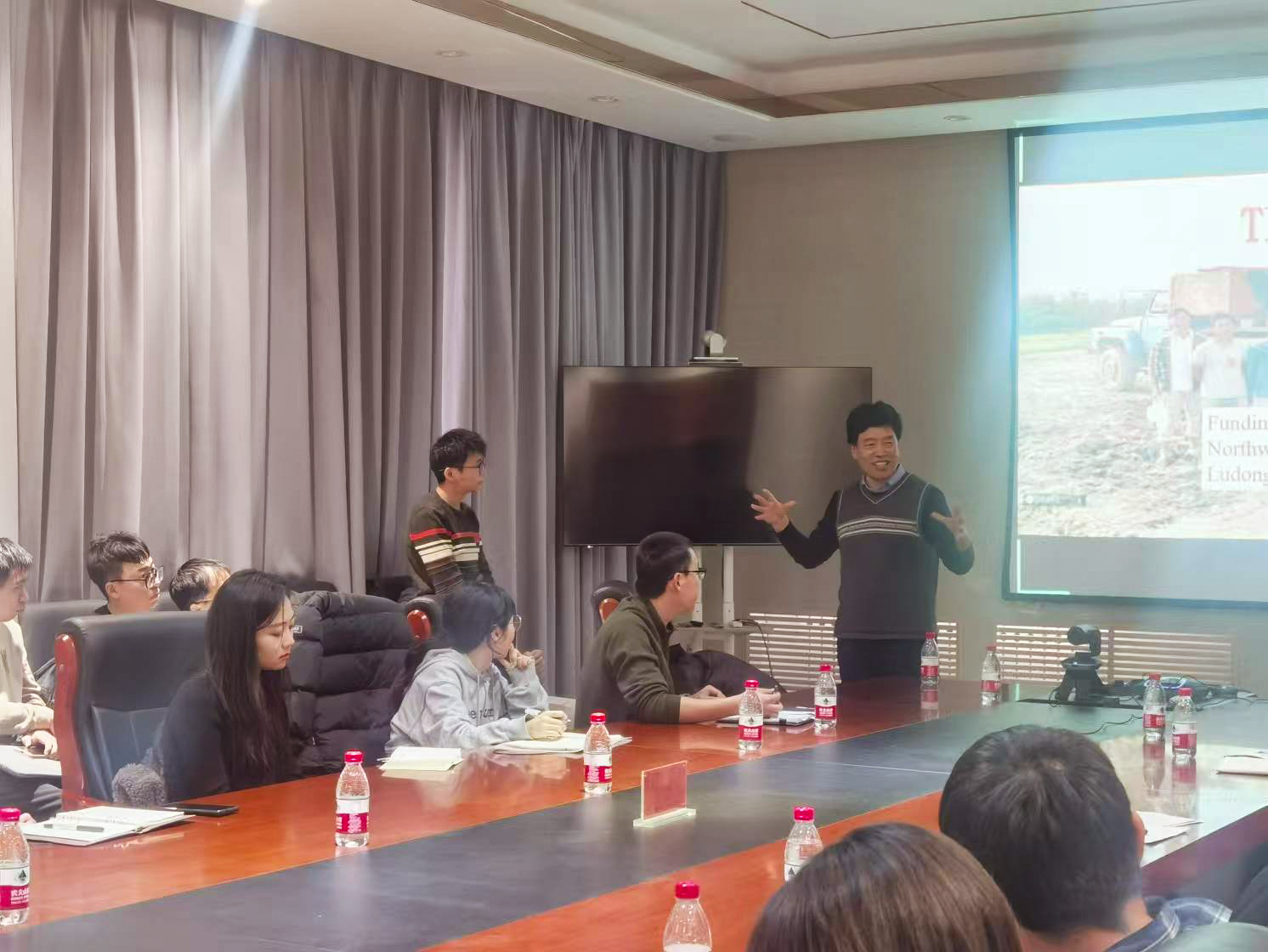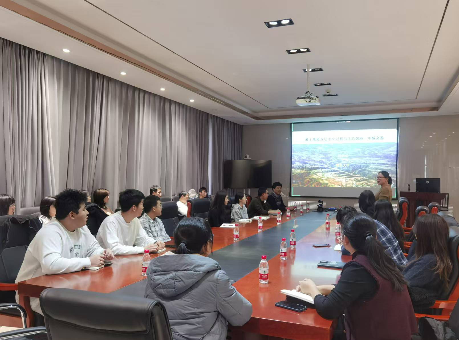 司炳成教授以“相較于淺根植物,深根系植物如何影響地下水補(bǔ)給?如何消耗深層土壤水?能不能增加地下碳儲(chǔ)存?”三個(gè)問題開篇,詳細(xì)講解了淺根系與深根系植被下地下水補(bǔ)給的控制因子,探討了地下水同位素與補(bǔ)給機(jī)制,介紹了深層土壤水與碳的交換過程。司炳成教授還展示了基于林齡與深層土壤水分虧缺之間的邏輯增長關(guān)系模型,用于估算區(qū)域尺度人工林的深層土壤水分虧缺,并介紹了基于深層土壤水分虧缺與深層根系碳儲(chǔ)量之間的Logistic關(guān)系模型,估算了區(qū)域尺度人工林的深層根系碳儲(chǔ)量。司炳成教授的報(bào)告深入淺出,極具指導(dǎo)意義,激發(fā)了所在領(lǐng)域科研人員和研究生的思考。與會(huì)師生與司炳成教授展開了深入交流,收獲了寶貴的學(xué)術(shù)啟發(fā)。