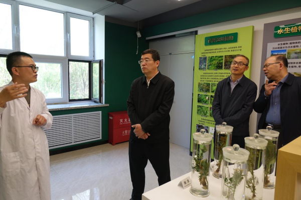 馬延峰首先來到農業樓鹽堿地農業研究中心,楊帆高級工程師系統介紹了蘇打鹽堿地治理關鍵技術、土壤改良劑研發與利用、耐鹽堿水稻、大豆、羊草等作物品種選育及鹽堿地生態修復工程實施等工作情況和科研進展。