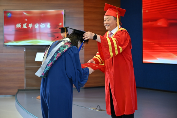 在學(xué)位授予儀式環(huán)節(jié)中,畢業(yè)生依次上臺(tái),姜明為全體畢業(yè)生頒發(fā)了畢業(yè)證書(shū),并為畢業(yè)生扶正流蘇,合影留念。