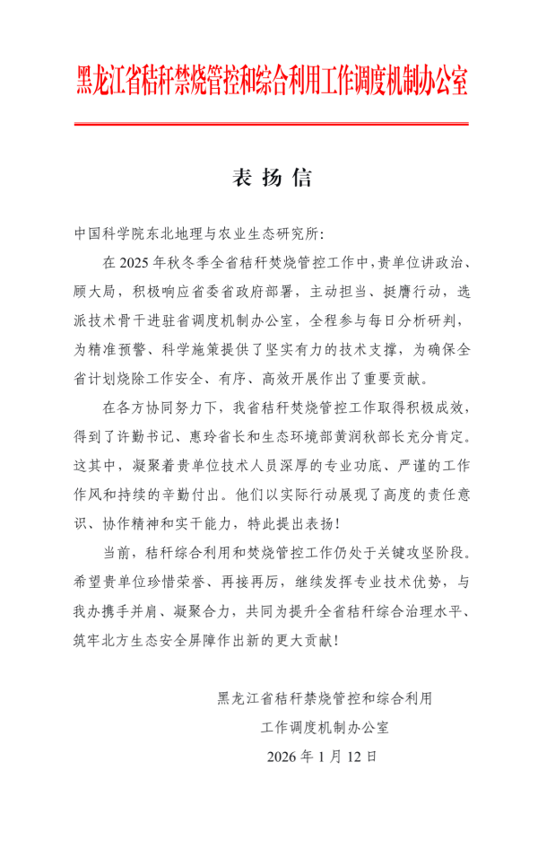 近日,黑龍江省秸稈禁燒管控和綜合利用工作調(diào)度機制辦公室以信函形式對中國科學(xué)院東北地理與農(nóng)業(yè)生態(tài)研究所予以表揚,對東北地理所在2025年秋冬季秸稈焚燒管控工作中的重要貢獻表示感謝。濕地與全球變化學(xué)科組陳衛(wèi)衛(wèi)研究團隊參與構(gòu)建黑龍江省秸稈數(shù)智化管控平臺,并選派技術(shù)骨干石博文、王梧陽、邢文甫等人全程參與省級調(diào)度和分析,為精準預(yù)警和科學(xué)施策提供了關(guān)鍵科技支撐。