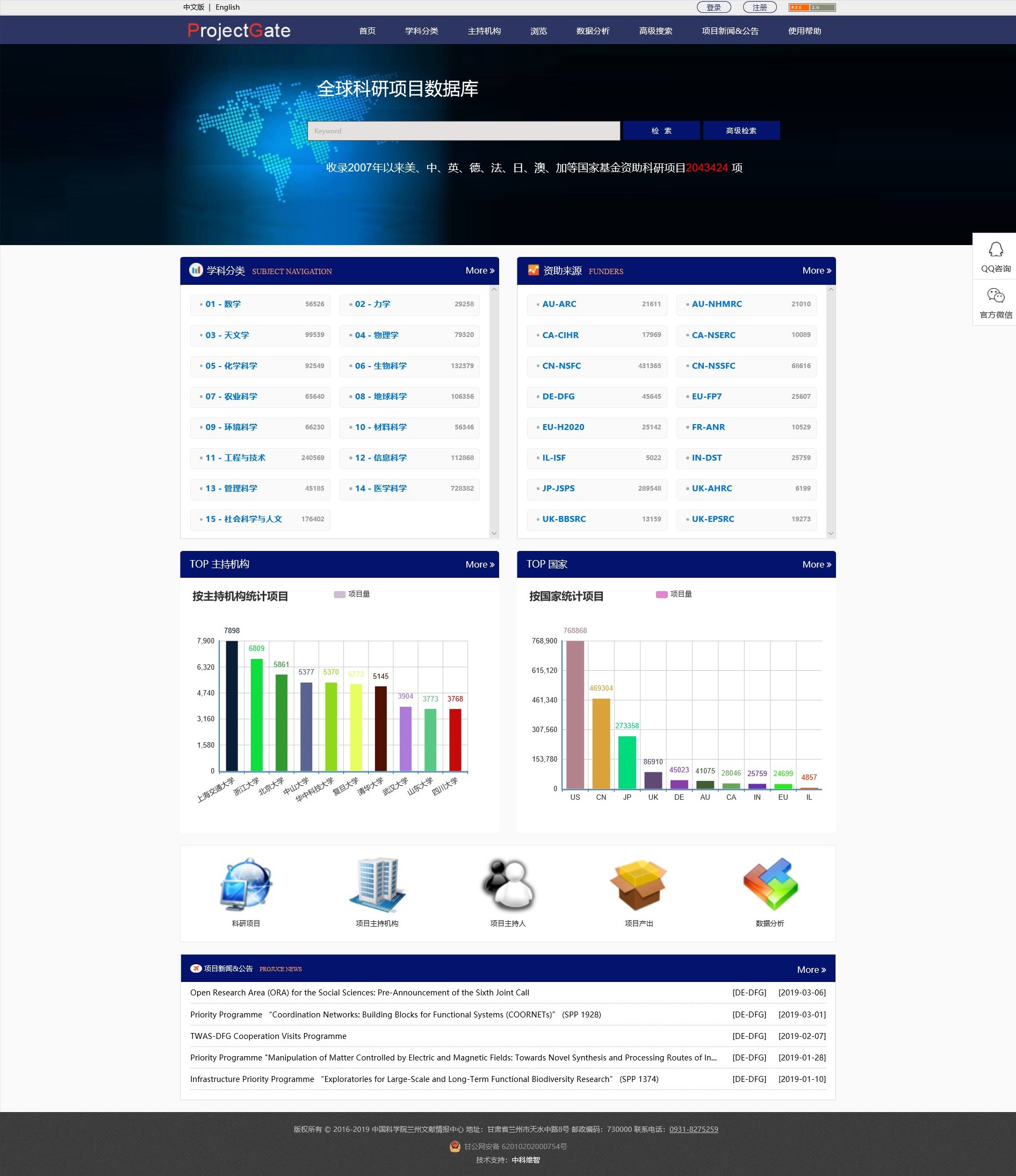 “全球科研項目數(shù)據(jù)庫(ProjectGate)”于2017年由中國科學院蘭州文獻情報中心建設完成。科研項目信息可以完整清晰地反映一個國家的科技部署、科研實力以及研究重點的變化、科技創(chuàng)新的軌跡,為科研用戶項目申報、分析本領域研究熱點、研究選題、尋找合作機構(gòu)和合作者等提供重要的信息支持。全球科研項目數(shù)據(jù)庫的建設為科研人員集成方便的發(fā)現(xiàn)全球主要發(fā)達國家科研項目信息提供了重要的信息保障。