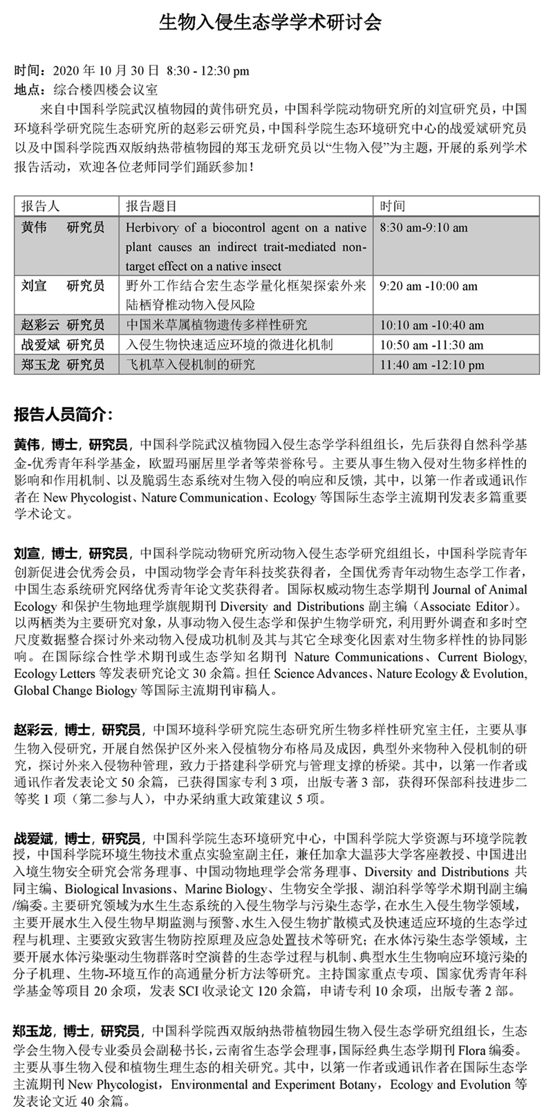 生物入侵生態學學術研討會通知-黃偉 研究員、劉宣 研究員、趙彩云 研究員、戰愛斌 研究員、鄭玉龍 研究員