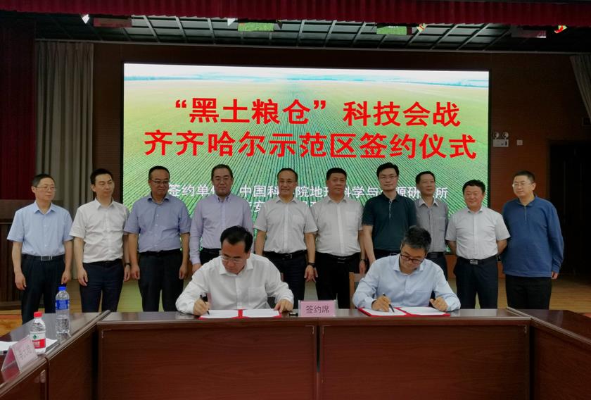 6月16日,張濤與齊齊哈爾市政府主要領導召開座談會并簽署示范區建設協議。齊齊哈爾市副市長李擁軍在致辭中說,多年來,中科院、黑龍江省農科院對齊齊哈爾市黑土地保護與利用工作給予了大力支持和精心指導,奠定了“黑土糧倉”科技會戰合作的堅實基礎,齊齊哈爾市將以本次合作為契機,在黑土地保護利用關鍵技術等方面強化科研攻關,重點在黑土健康調控與農產品品質創優、黑土地保育增效技術、高寒黑土多源增碳增效技術、黑土地保護利用與鄉村振興有機融合、黑土糧倉全域定制模式創建與示范應用五個方面開展模式攻關,進一步加強溝通合作,共筑友誼金橋,共享合作碩果,共同保護好“耕地中的大熊貓”。