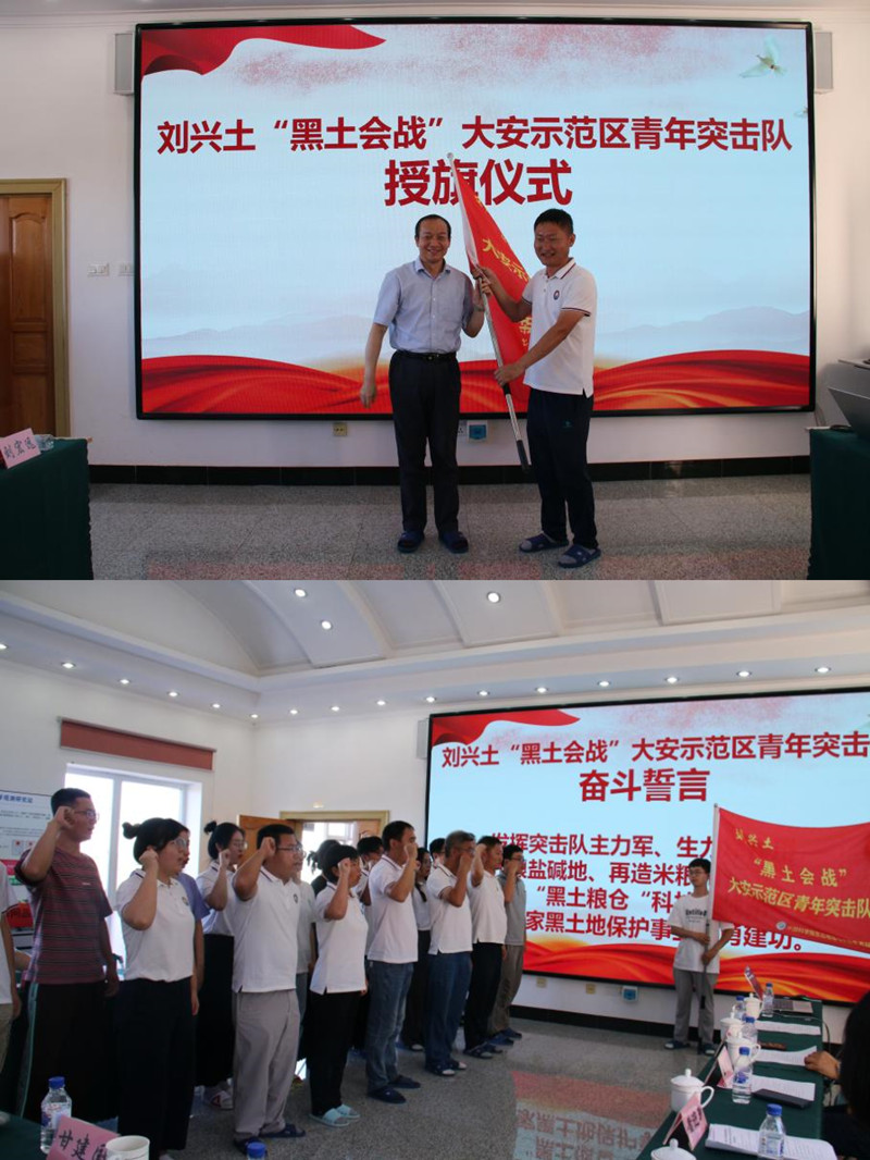 座談會上舉辦了以老科學(xué)家命名的突擊隊授旗儀式。文波龍副研究員簡要介紹劉興土院士先進(jìn)事跡,李和風(fēng)向劉興土“黑土?xí)?zhàn)”大安示范區(qū)青年突擊隊授旗,青年突擊隊進(jìn)行奮斗誓言宣誓,錚錚誓言,體現(xiàn)了新一代的科研工作者以老科學(xué)家精神為引領(lǐng),緊密圍繞國家重大戰(zhàn)略需求奮勇建功的信心和決心。