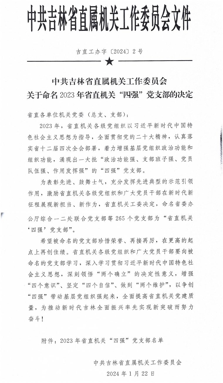 吉林省直機(jī)關(guān)工委為表彰先進(jìn)、鼓舞士氣,充分發(fā)揮先進(jìn)典型的示范引領(lǐng)作用,激勵省直機(jī)關(guān)各級黨組織和廣大黨員干部在新時代新征程展現(xiàn)新?lián)?dāng)、新作為,共命名265個黨支部為“省直機(jī)關(guān)‘四強(qiáng)’黨支部”,東北地理所大豆第一黨支部位列其中。