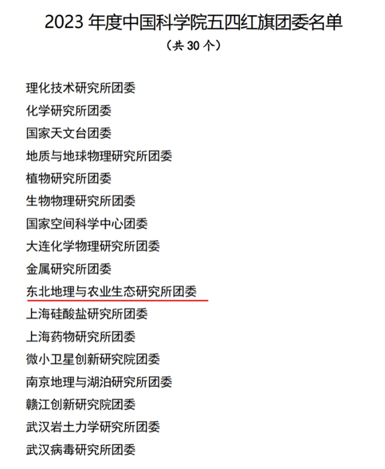 為表彰先進(jìn)、樹(shù)立典型,激勵(lì)團(tuán)青組織和廣大團(tuán)員、團(tuán)干部奮勇?tīng)?zhēng)先、再創(chuàng)佳績(jī)。近日,中國(guó)科學(xué)院團(tuán)委發(fā)文對(duì)30個(gè)五四紅旗團(tuán)委、30個(gè)五四紅旗團(tuán)支部、50名優(yōu)秀共青團(tuán)干部、100名優(yōu)秀團(tuán)員青年進(jìn)行表彰。中國(guó)科學(xué)院東北地理與農(nóng)業(yè)生態(tài)研究所團(tuán)委榮獲“2023年度五四紅旗團(tuán)委”稱號(hào)、2023級(jí)博士研究生龍小雨榮獲“2023年度中國(guó)科學(xué)院優(yōu)秀共青團(tuán)員”稱號(hào)。