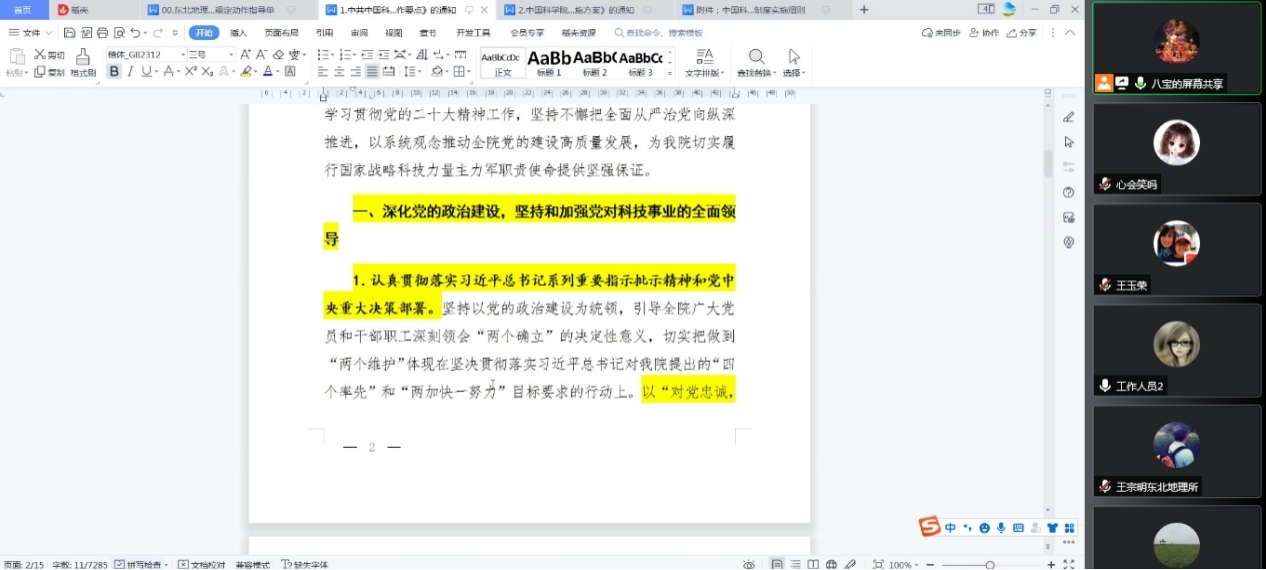 會前,各位黨員已經自學了《中國科學院2022年黨的建設工作要點》、《中國科學院“基層組織建設見成效”活動實施方案》。會上,郭琳對兩個文件的要點進行了領學,對重點內容進行了詳細介紹,并對下一步工作開展和落實提出要求,便于人事黨支部在恢復正常上班后相關工作的開展。郭琳還強調了意識形態工作,請各位黨員提高思想意識,積極傳播正能量。
