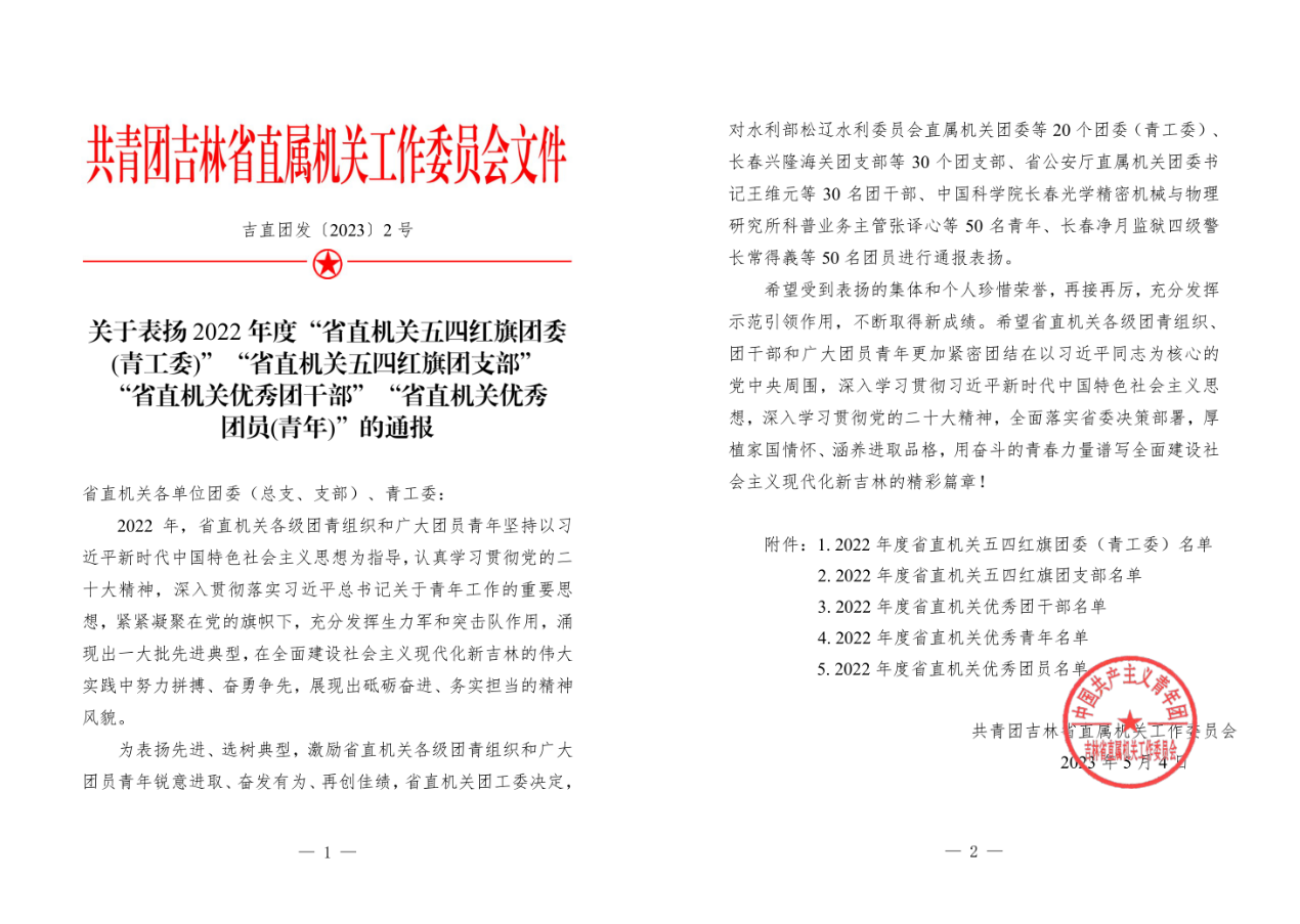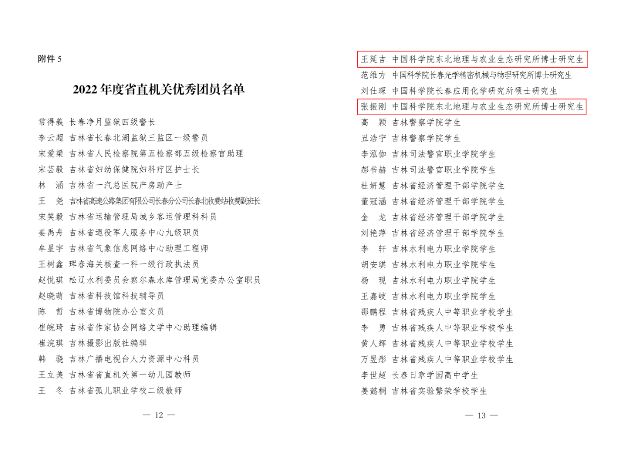 為表揚先進、選樹典型,激勵省直機關各級團青組織和廣大團員青年銳意進取、奮發有為、再創佳績,吉林省直機關團工委對20個五四紅旗團委(青工委)、30個五四紅旗團支部、30名優秀團干部、50名優秀青年、50名優秀團員進行通報表揚。中國科學院東北地理與農業生態研究所2020級博士研究生張振剛、2021級博士研究生王延吉榮獲“吉林省直機關優秀團員”稱號。